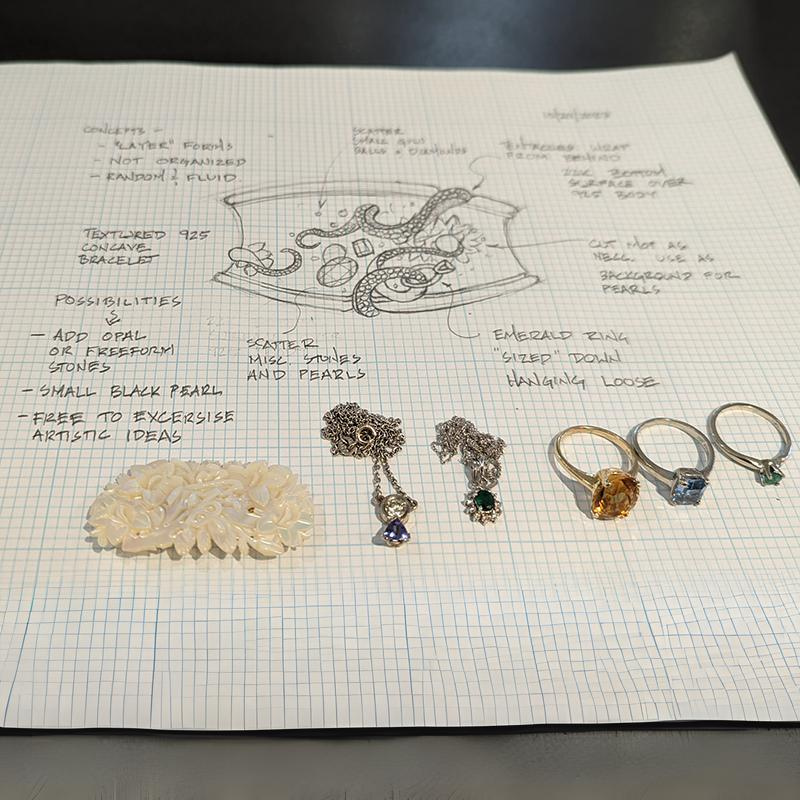 Behold, a bold masterpiece cuff bracelet in sterling silver and 22K yellow gold that truly captures the concept of "Treasure Under the Sea." From pieces of carved mother-of-pearl from mom to partial rings to a multitude of unworn diamonds, the finished piece is nothing short of a spectacular showstopper...good thing Miss E isn't shy!