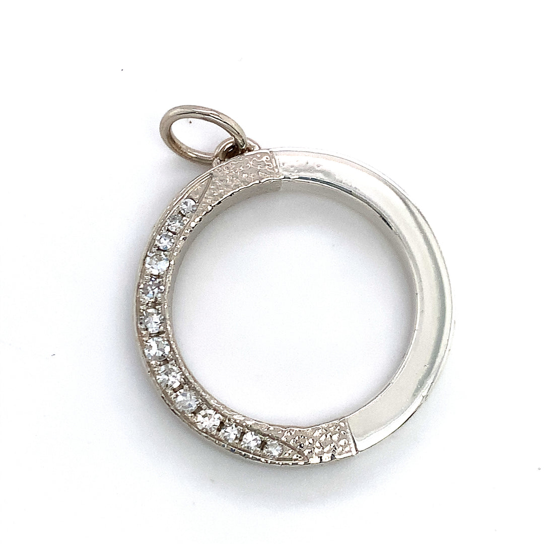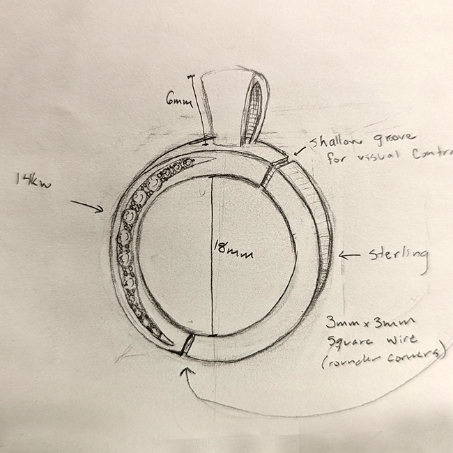 Initial design concept for Lady D's pendant: recycled white gold, with the texture from the original ring (to signify mom); diamonds from grandma...and sterling silver to represent Lady D herself. A circle to tie together the 3 generations.