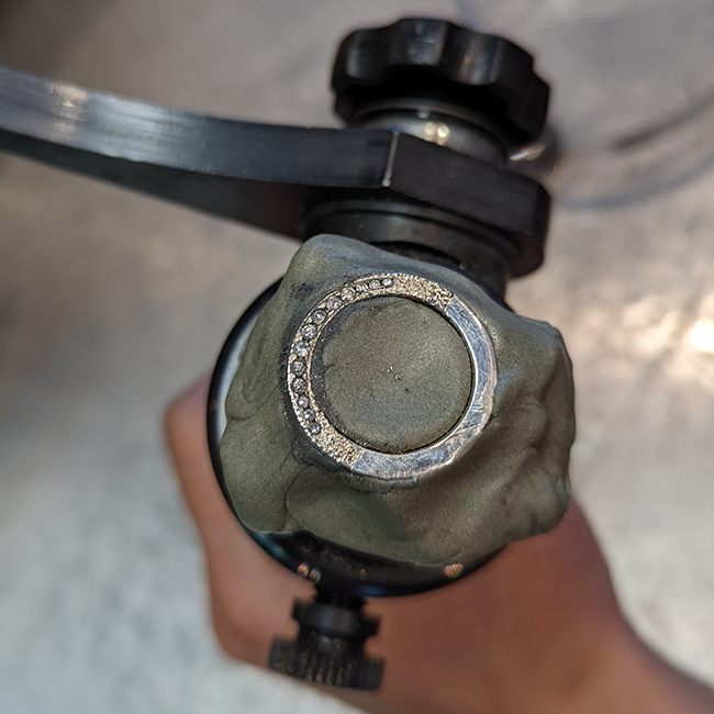 The white gold has been melted down and reworked into its final shape by goldsmith Molly; the new silver has been joined to it to form an open circle...now it's diamond setting time!