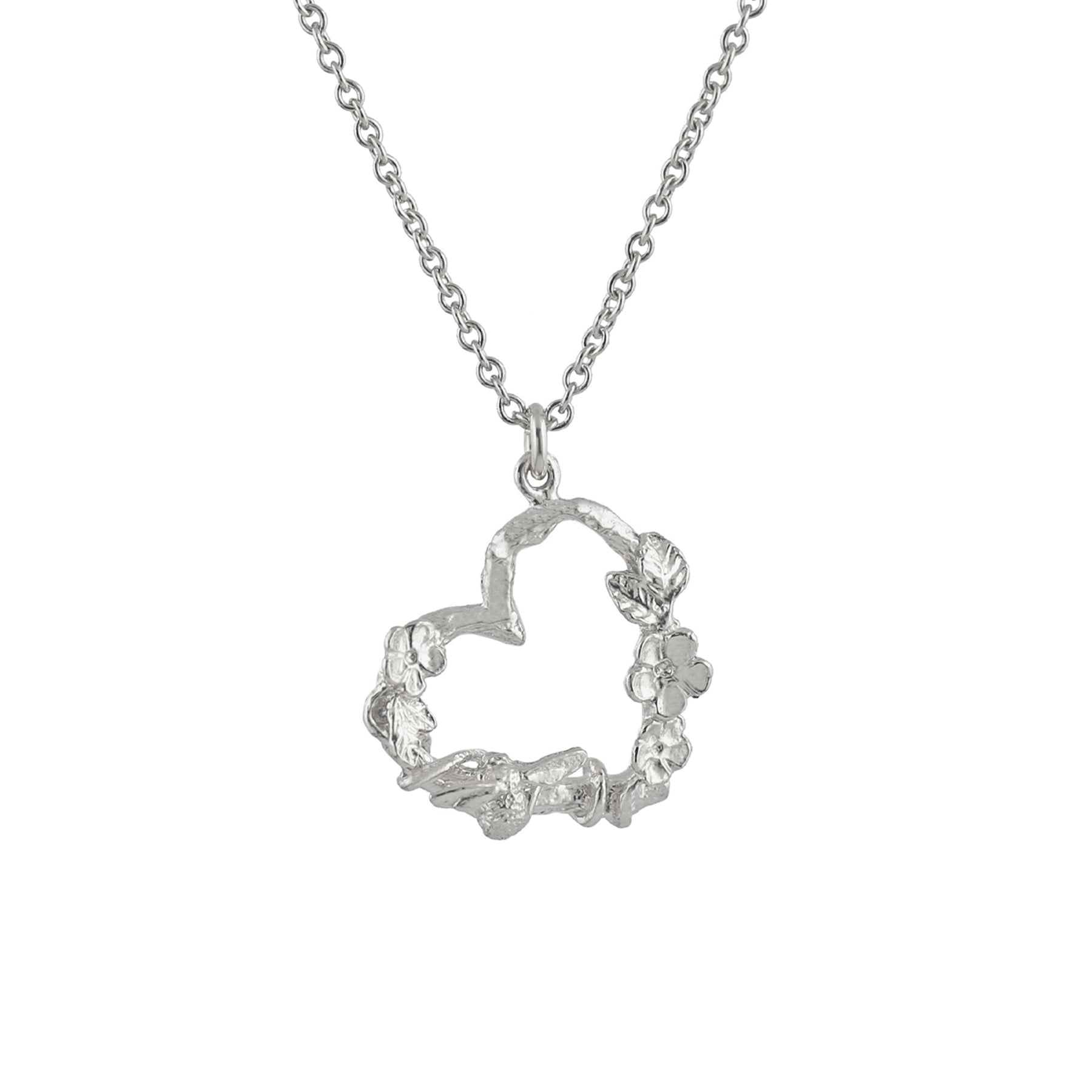 In a collection designed to compliment Alex Monroe's classic Bee styles, pretty florals are greeted by their fuzzy, buzzy friends in this sweet heart-shaped pendant. An itsy bitsy bee takes in the delights of this sweet floral shaped trellis, adorned with the daintiest of flowers.