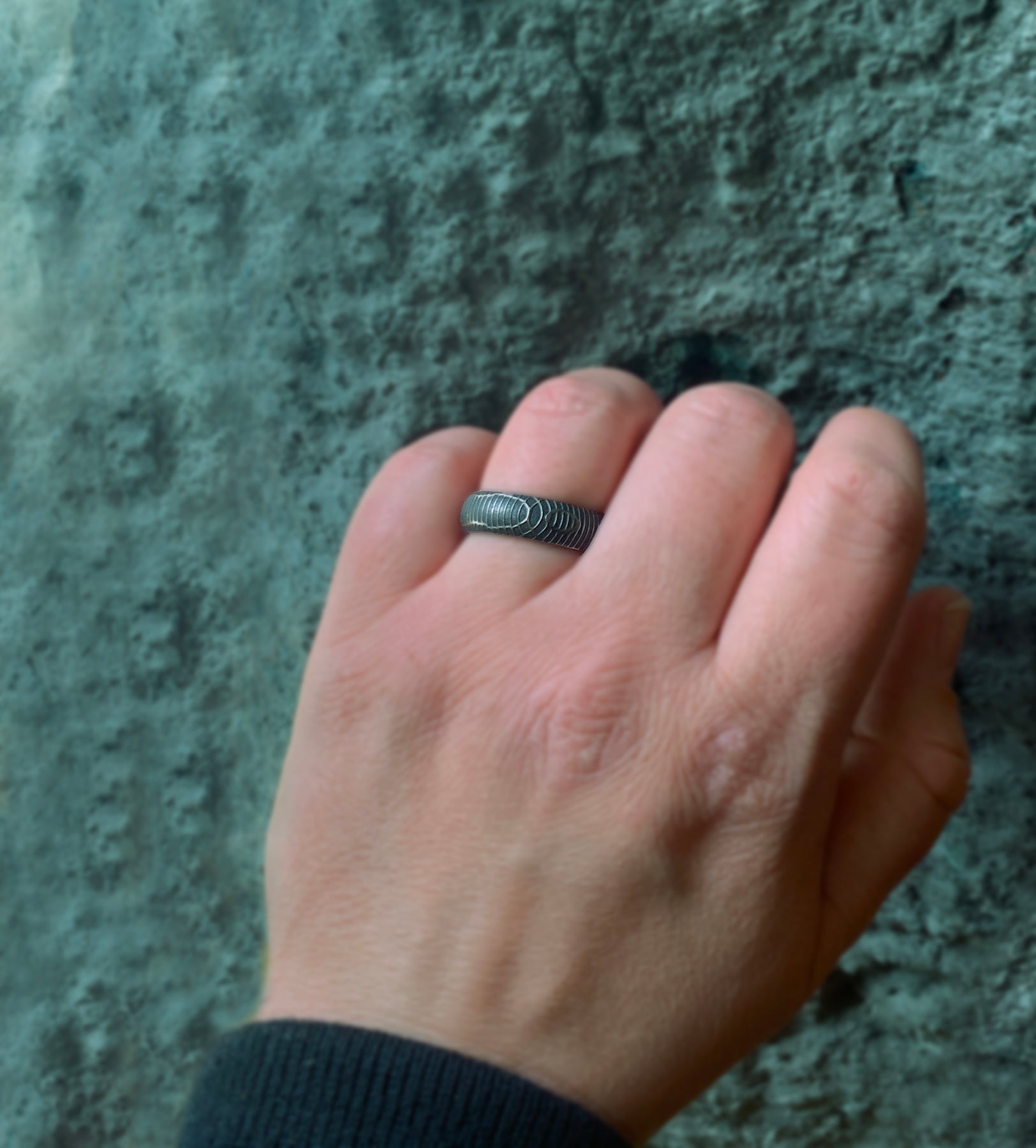 Crafted from Damascus steel with a forged carbon fiber interior sleeve, this band features a distinctive wavy pattern that adds a bold, textured look.