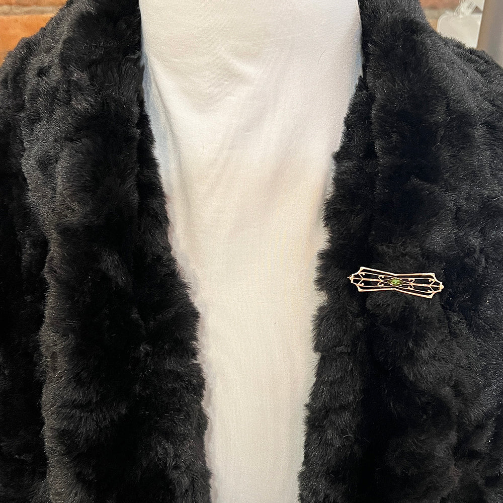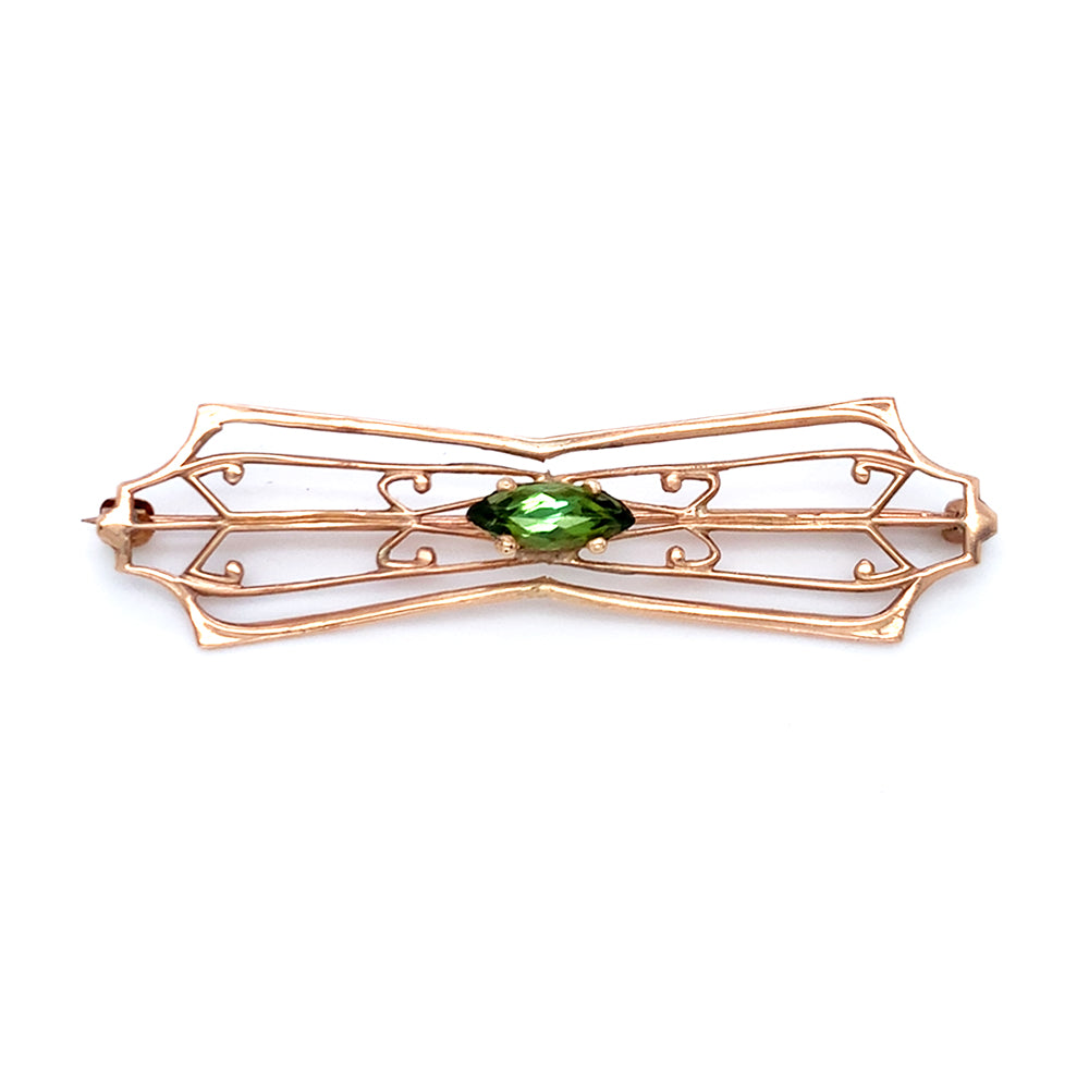 An elegant Antique Edwardian bar brooch, beautifully crafted in yellow gold, featuring a striking marquise-cut green tourmaline at its center.