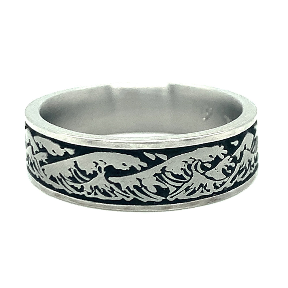 The powerful waves on this band are reminiscent of Katsushika Hokusai's iconic print -The Great Wave off Kanagawa. A beautiful blend of artistry with contemporary materials, this is a perfect alternative toa traditionally styled wedding band.