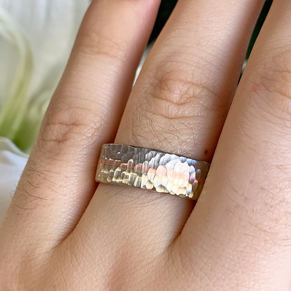 Like the stripes of a rainbow trout, this men's band features a striking trio of 10K white, rose, and green gold. A directional hammered finish adds a fish scale texture for a unique and subtly shimmery look. Mike Webb's Mountain HeirΒ collection is made in Bozeman and celebrates the beauty and inspiration of nature that surrounds us here in Montana. This rainbow trout ring is a perfect conversation piece for a night out on the town, and would also make a gorgeous and meaningful wedding band!