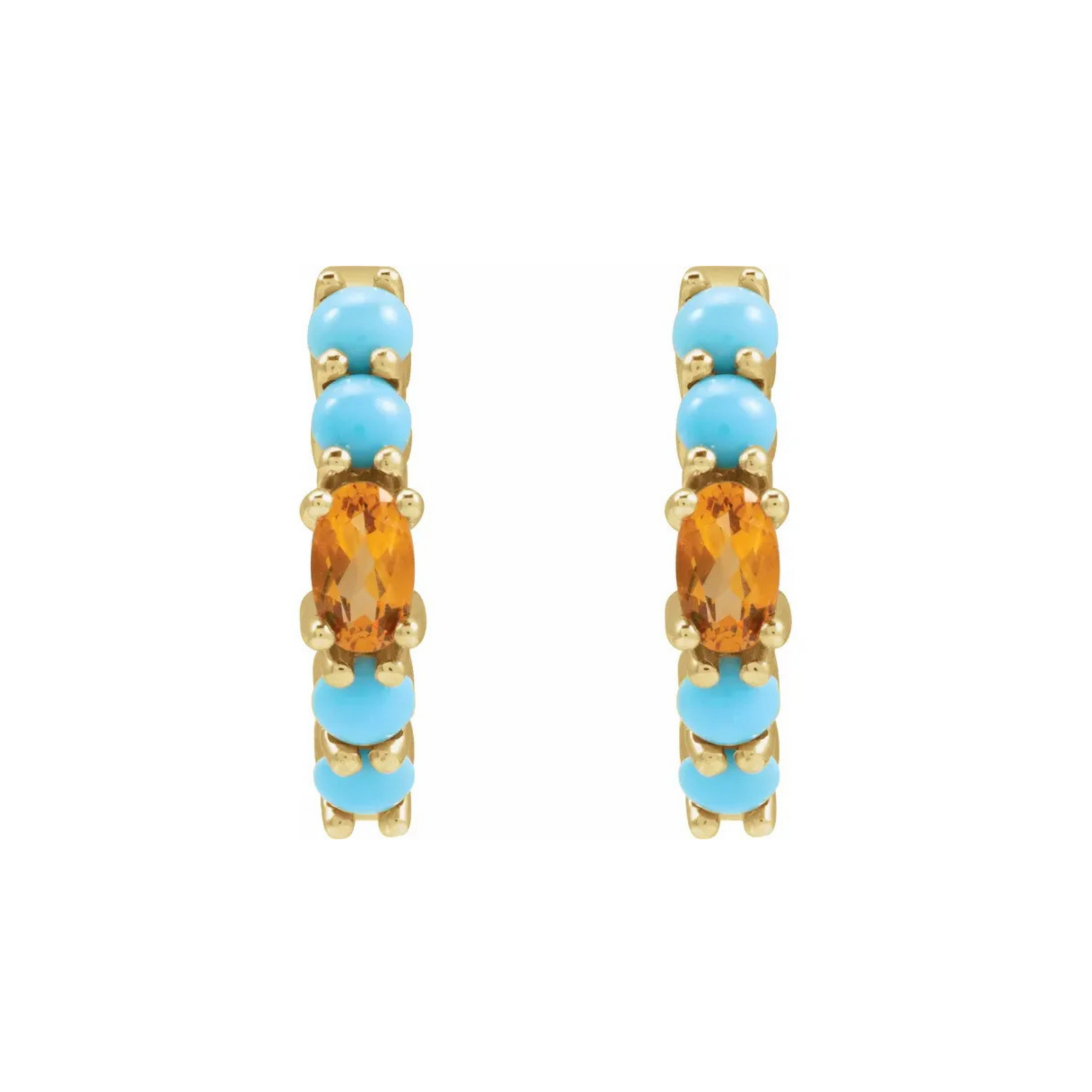 With the warm embrace of a Montana autumn, the yellow gold encompasses bright, natural oval citrines accented by two turquoise cabochons along each side. With the hinged hoop mechanism of these huggie earrings makes for a perfect, everyday piece of subtle elegance and user-friendly application. If you're a November baby or just adore citrine and turquoise, these are the perfect everyday earring for fall!
