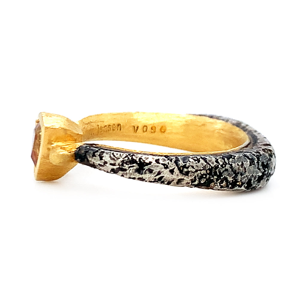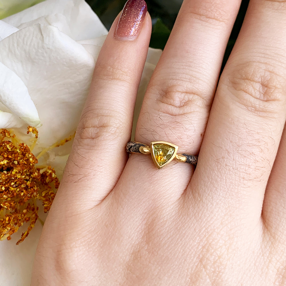 Like a glimmering fire, this bi-color trillion-shaped Montana sapphire is aglow with bright orange-gold and yellow-green tones embodied within a rich yellow-gold bezel. The rustic, distressed sterling silver compliments the warmth of the golden interior sleeve, creating a masterpiece of harmonized elements.