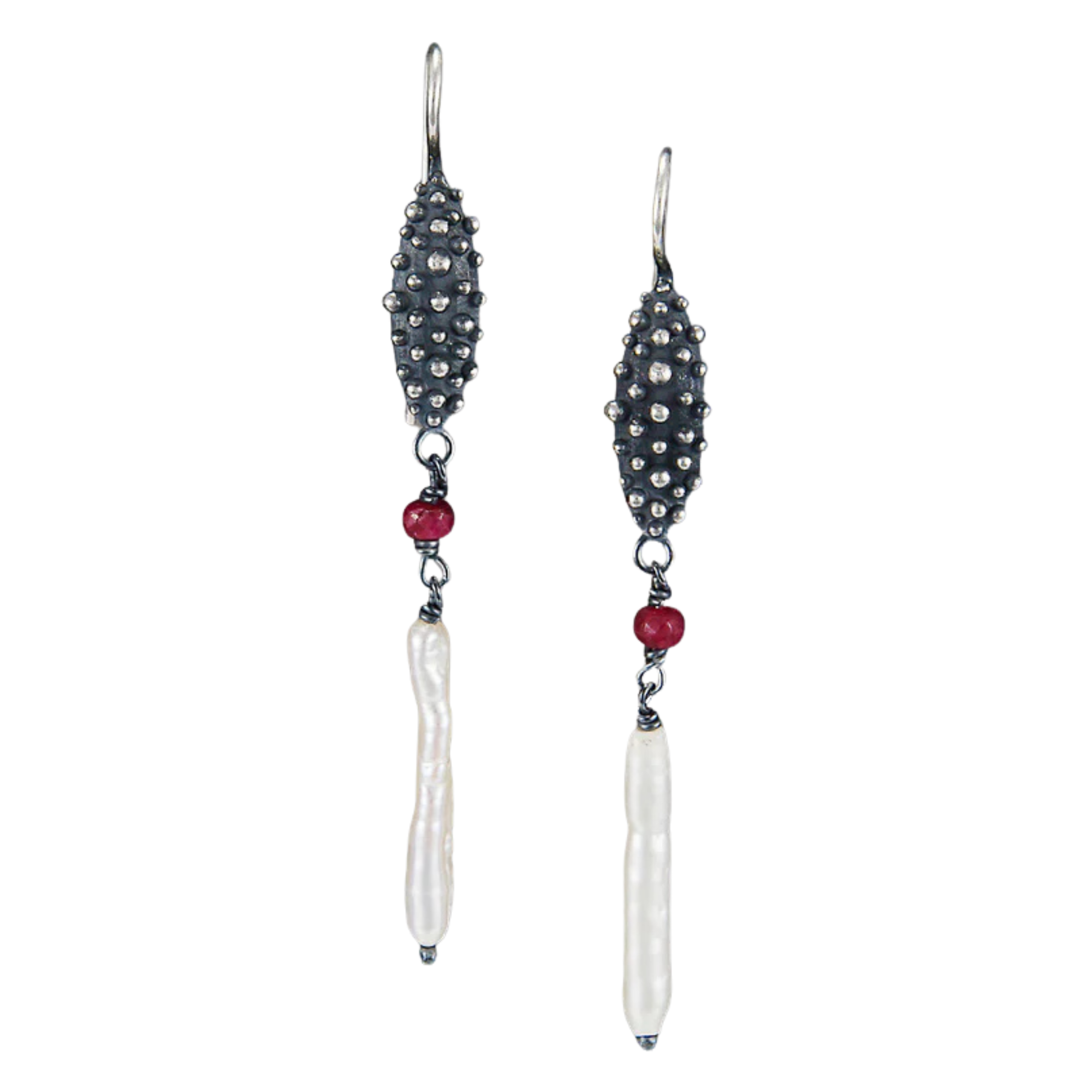 Dahlia Kanner's beautiful, elongated drop earrings feature oxidized silver with rubies and elongated pearls, giving earthy, edgy vibes. Each drop element adds its own charm to these earrings!