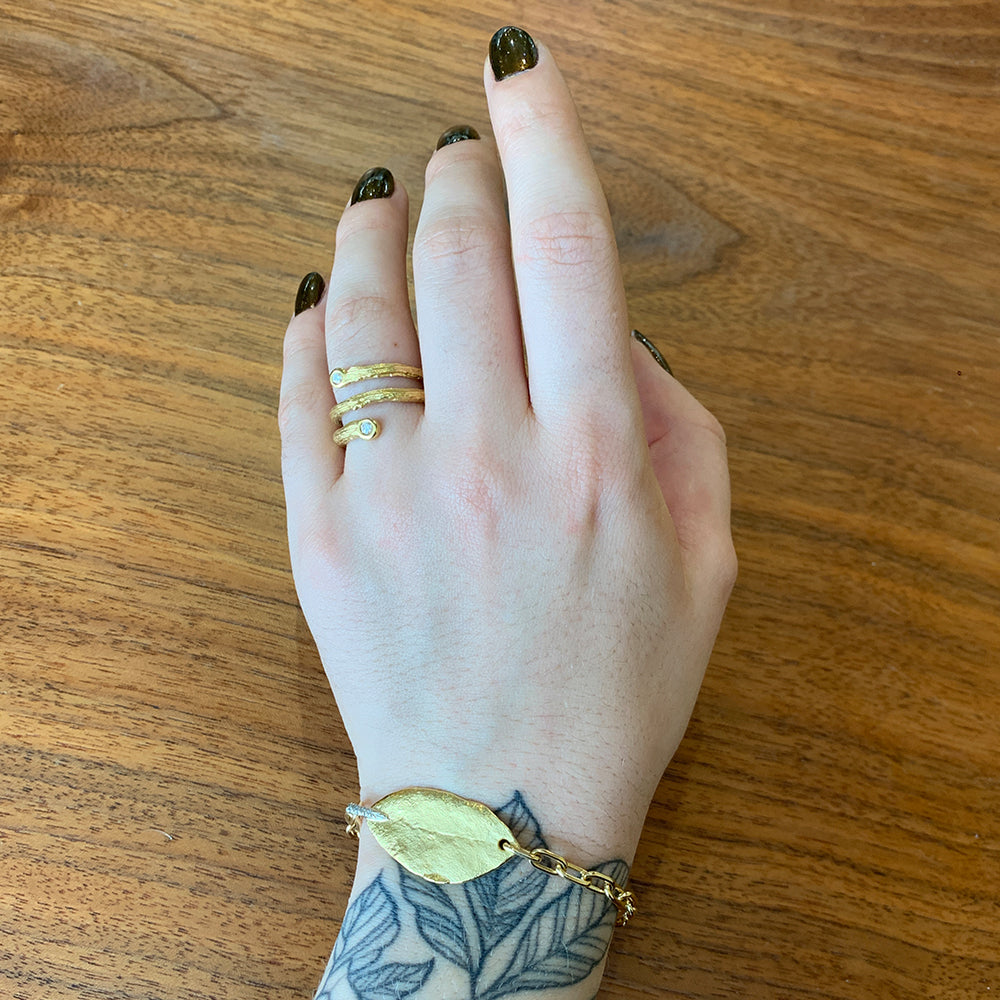 Intricate leaves, flowers, and organic elements serve as the inspiration for Aaron Henry's creations. Inspired by that nature, this link bracelet features a Southern oak leaf crafted in rich yellow gold with a platinum stem detail adorned in diamonds. Oval links and a white gold lobster closure complete this organic creation.