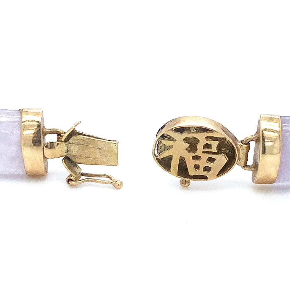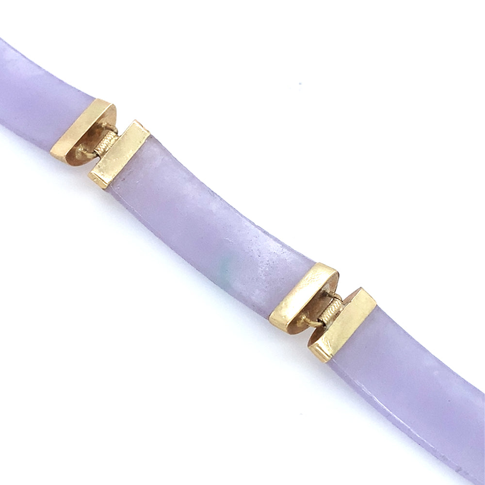 Envision the tranquility of flower fields and gardens with this romantic link bracelet. Crafted from lavender jadeite and luminous yellow gold, experience an elegant and feminine piece that is sure to turn heads. This romantic heirloom would make a wonderful gift for yourself or for that special someone's jewelry collection.