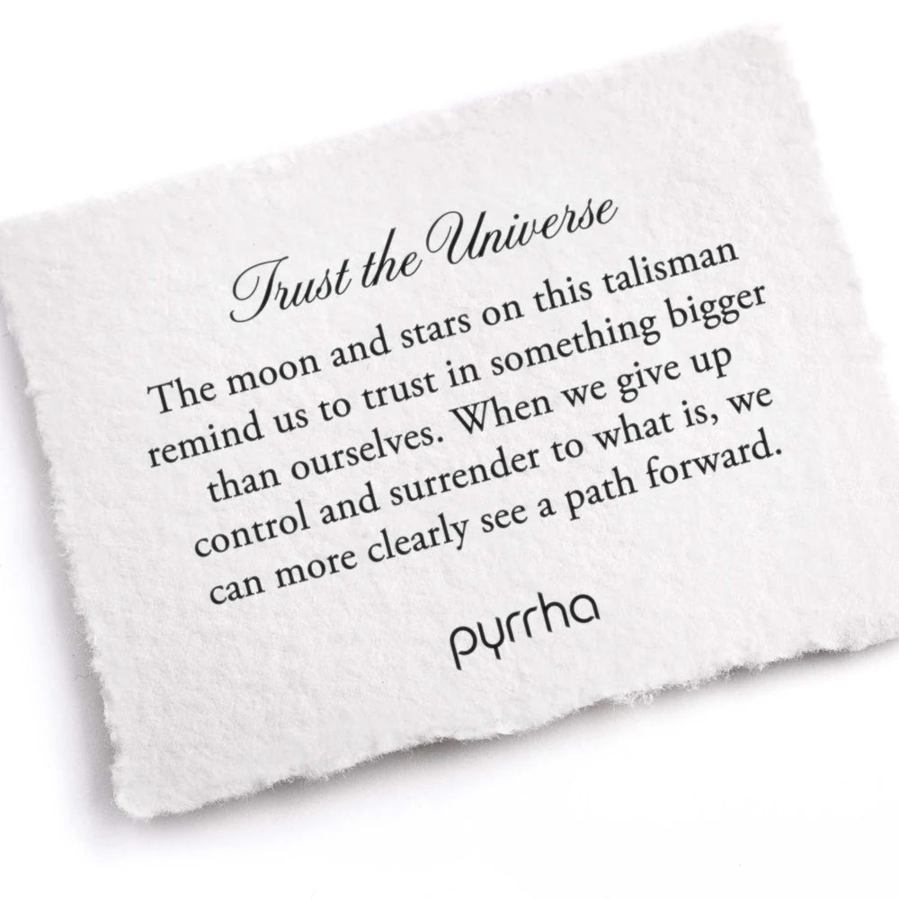 This talisman, with its celestial design, is crafted from bright silver, accented with contrasting black antiquing, and highlighted with a rich yellow gold crescent moon. The galaxy, moon, and stars remind us of our place in the universe and the importance of trusting in something greater than ourselves. It stands out beautifully on its own or pairs perfectly with other Pyrrha pieces for a look that's uniquely yours.