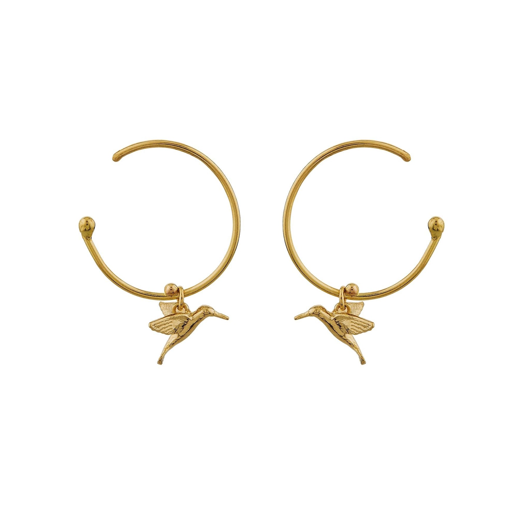 A pair of delicate teeny tiny hummingbird crafted in rich yellow gold, gently hover beneath a pair of hoop earrings! The Teeny Tiny collection by Alex Monroe recreates Alex's favorite pieces into miniature yellow gold creations... with all their exquisite details! Handcrafted in London, England.