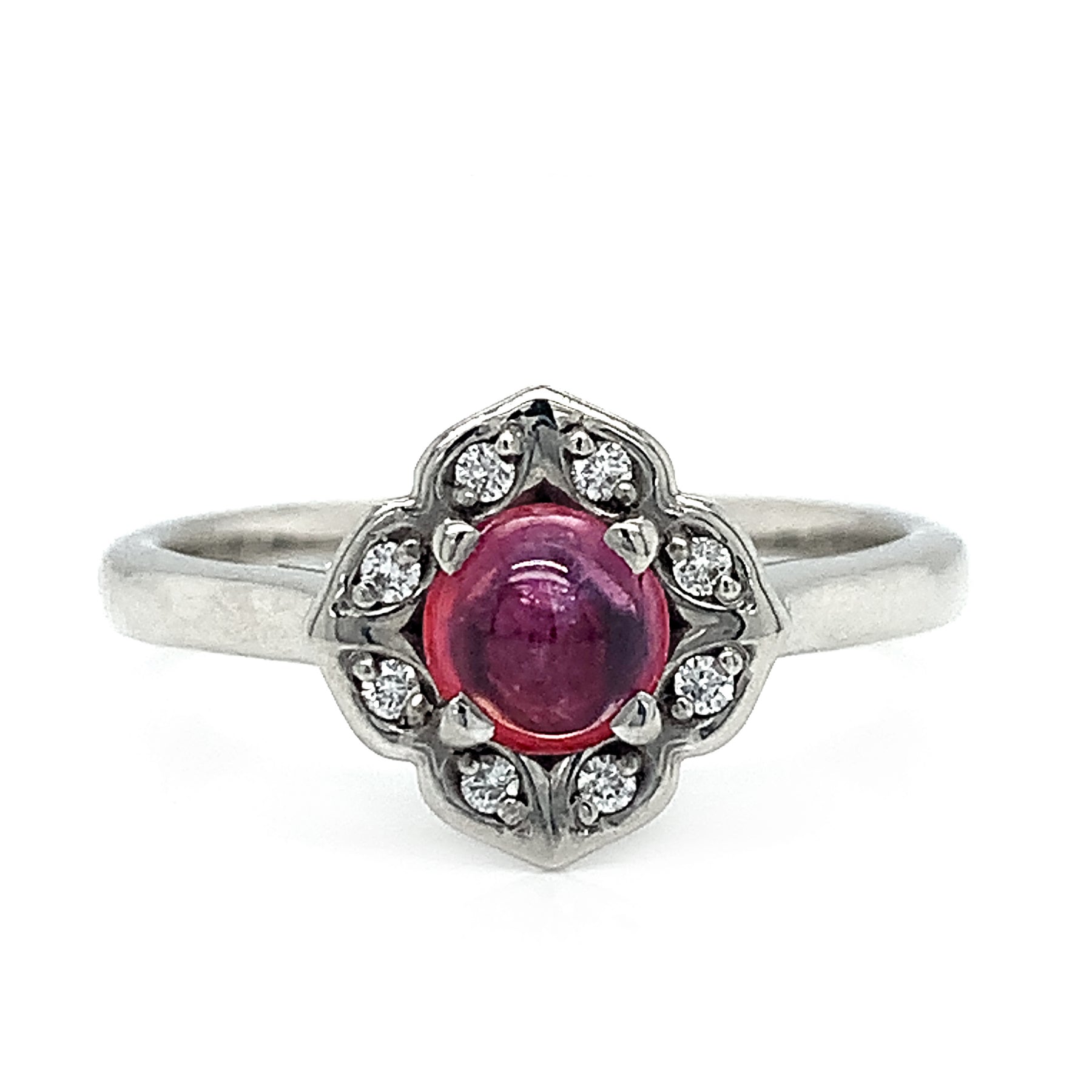 A glowy pink Montana sapphire cabochon shines from within a floral motif embellished with glittering diamonds. Elegant and beautiful, this lovely ring will be the star of any collection!