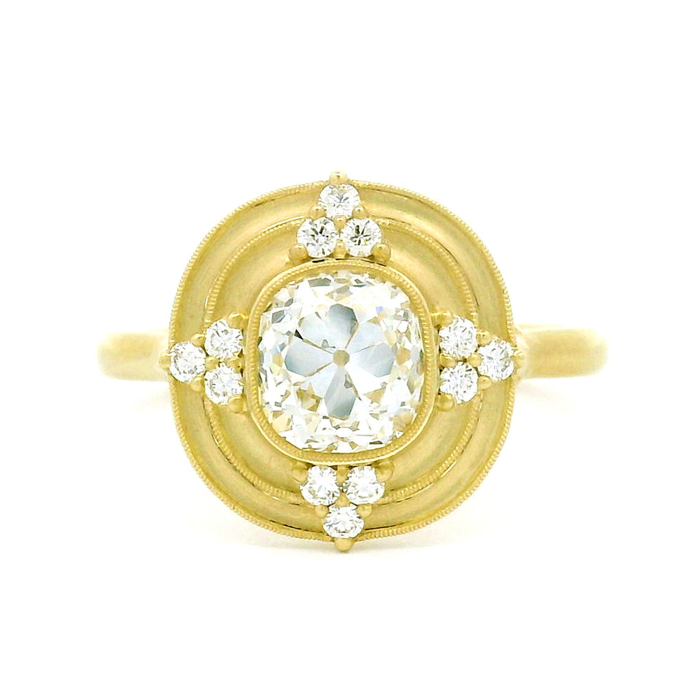 Embrace the brilliance of Erika Winters through this dazzling old mine-cut engagement ring. Crafted from rich yellow gold, the elegant halo, adorned with twelve diamonds, adds a touch of celestial allure to the piece. Intricate milgraining hand-finished throughout the design imparts a delicate yet vintage aesthetic that is bound to captivate. Embrace this ring as your own, knowing it will become a cherished heirloom for generations to come.