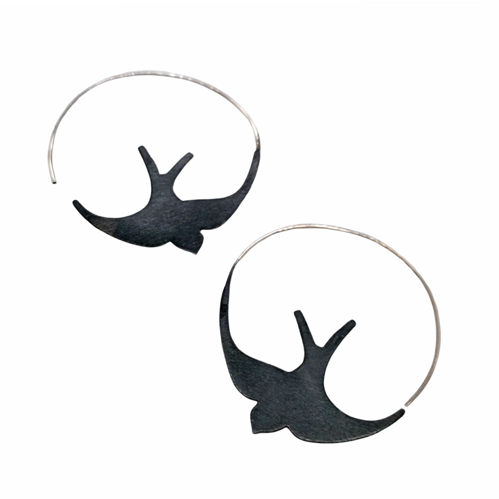 Handmade and lightweight, these bold oxidized sterling silver earrings feature two swooping swallows. The bird motif makes them the perfect gift for any birdwatcher or nature-lover in your life.Β