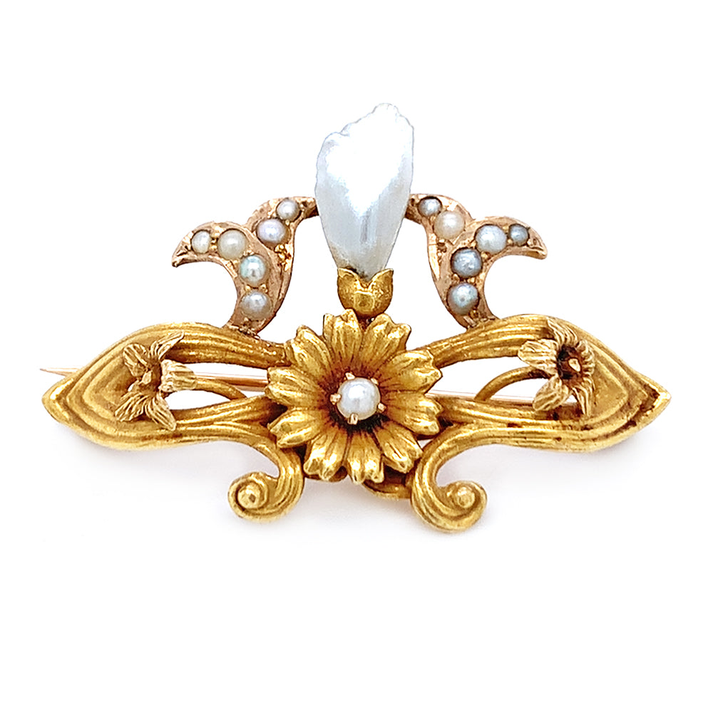 This antique art nouveau brooch has a hook for a watch or locket and is set with seed pearls and a wing pearl. It has a beautiful flower motif.