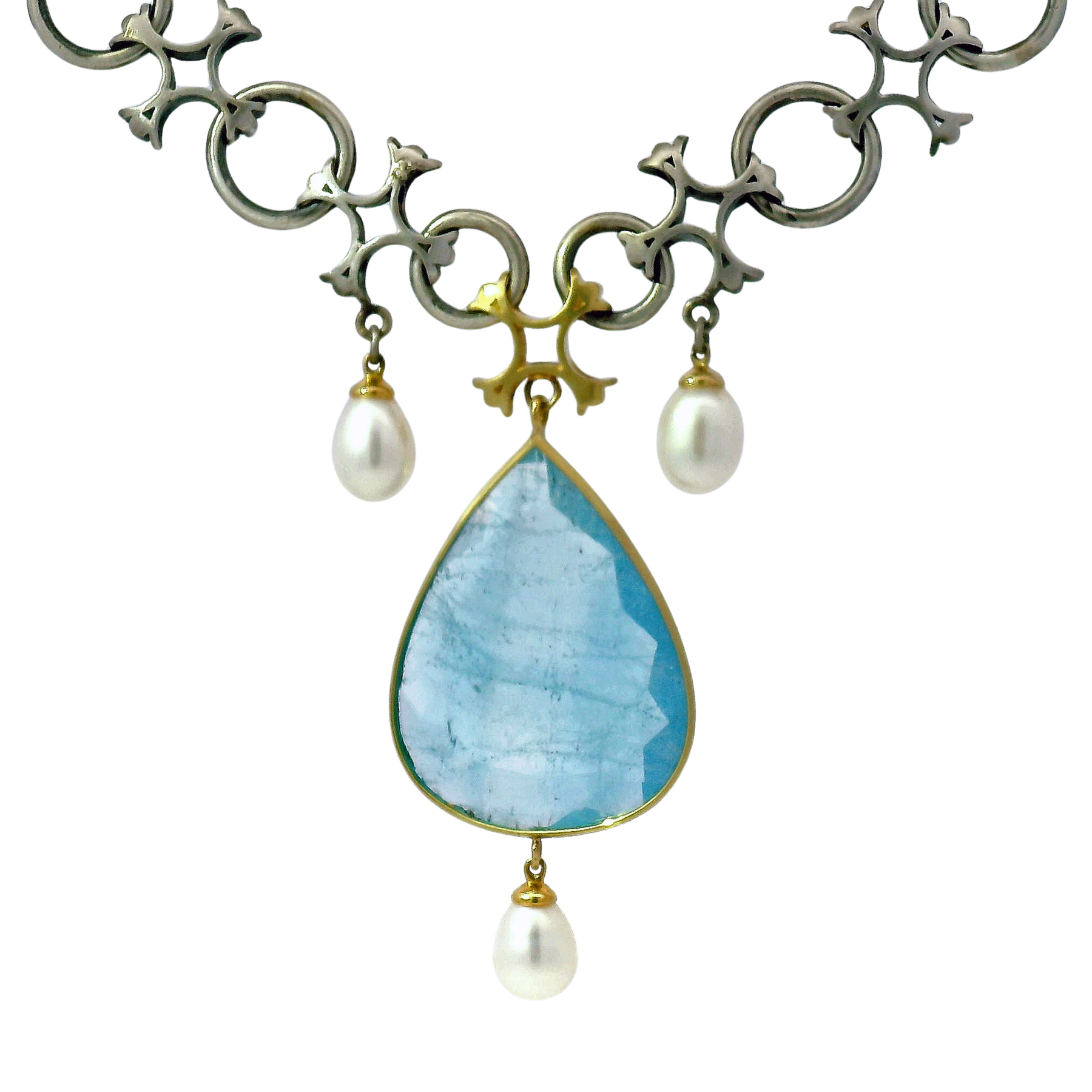 This Michael Jensen necklace blends old-world romance with modern refinement. An eye-catching, faceted pear-shaped aquamarine in its rich yellow gold bezel, the serene blue contrasting beautifully with the metal’s golden glow. Secured to an oxidized sterling silver cross motif chain, adding an architectural, antiqued elegance. Akoya pearls finish the design with soft luster and movement, creating a look that feels both timeless and bold.