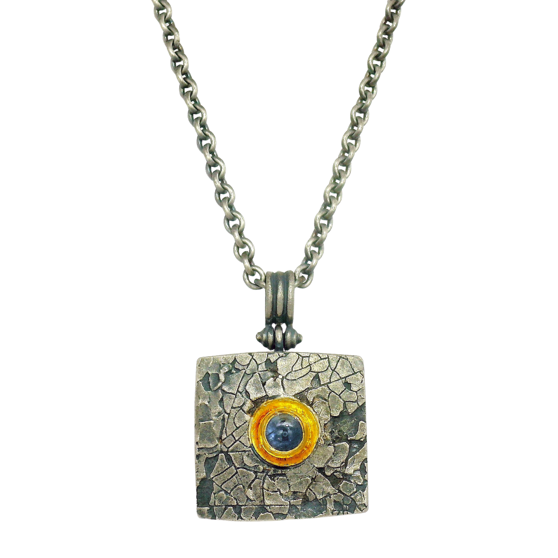 Like a treasure pulled from an ancient ruin, this necklace combines heavily distressed sterling silver with luxuriously rich yellow gold. A bright blue Montana sapphire cabochon gleams from the center of the pendant. Unique and intriguing, this necklace will complete any outfit!