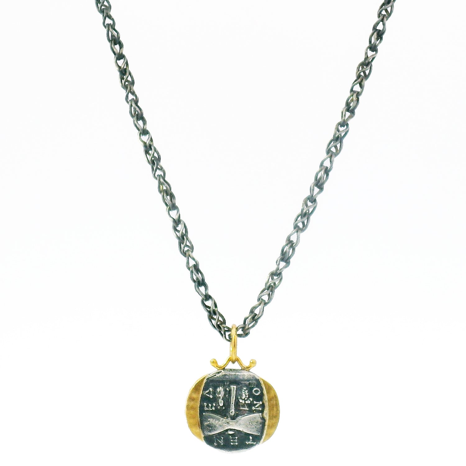 Historically, Janus symbolizes transitions, doorways, and the cyclical nature of time... the beginning and the end. Crafted in rich yellow gold and oxidized sterling silver, this ancient coin inspired pendant captures the dual-faced visage of the ancient Roman deity. Petite natural diamonds frames both faces with the reverse side of the pendant featuring a ancient text and a hammer motif.