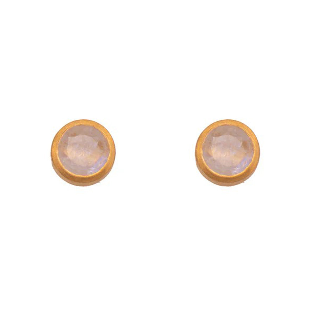 These delightful little studs feature faceted rainbow moonstone that glints in the light. Wrapped in a bezel of gold-plated sterling silver, these earrings are simple and splendid all in one!