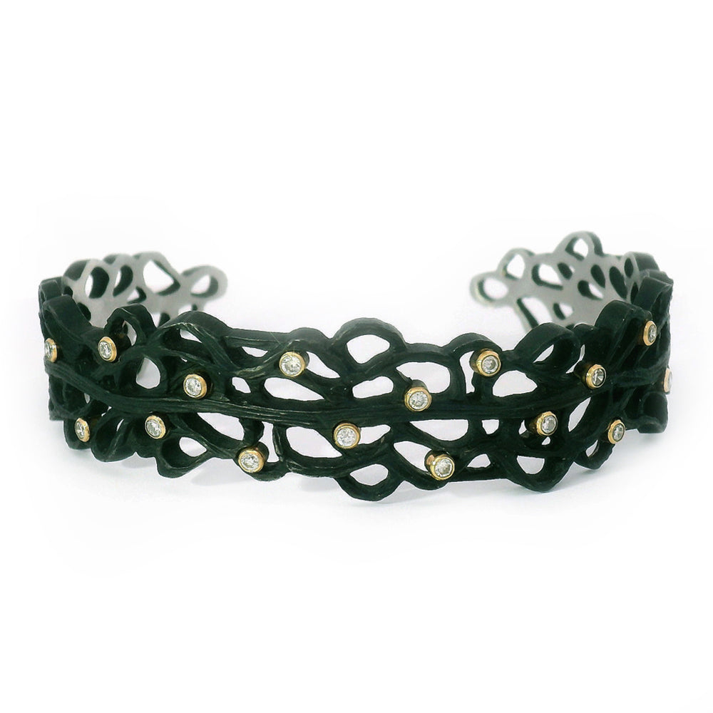 This sculptural cuff by Sarah Graham is crafted from blackened cobalt chrome with accents of yellow gold. Each diamond is bezel-set, boasting a sparkle that's a glint of light slipping through the darkness. Inspired by the shapes and movement of shadows, the openwork design feels both organic and bold.