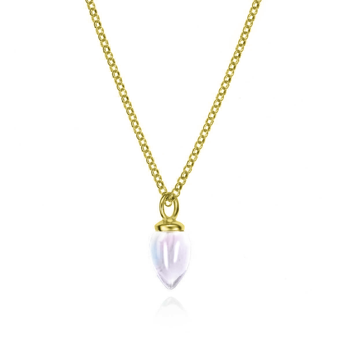 This understated pendulum necklace showcases a moonstone gem that swings gracefully from a delicate chain. The stoneโs natural shape varies with each piece, ensuring a one-of-a-kind silhouette that balances organic beauty with modern elegance.