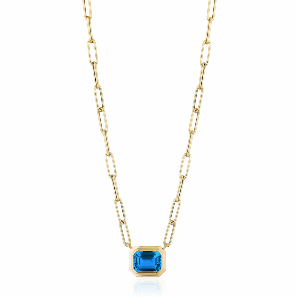 This necklace showcases a richly hued, emerald-cut London blue topaz, bezel-set in warm yellow gold. The captivating gemstone seems to float gracefully from a modern paperclip chain, lending the piece a sleek, architectural elegance with a quietly romantic edge.