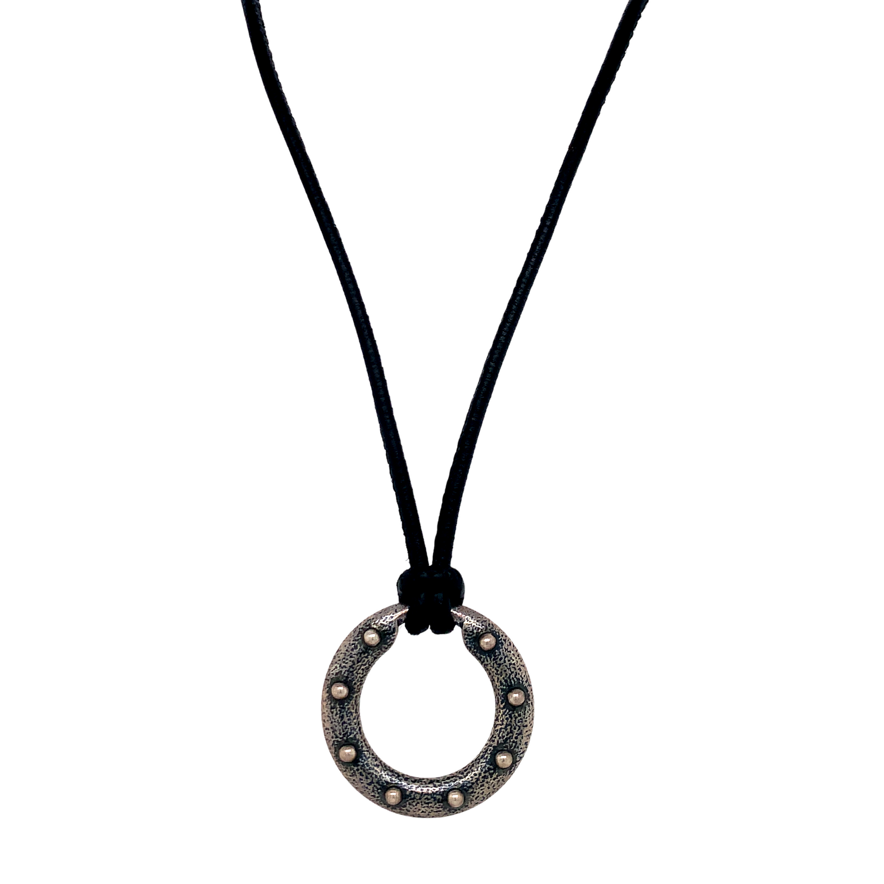 With a unique, handmade feel, this textured circular pendant is accented with small spheres orbiting around the front. Secured by black leather and connected by a custom hook clasp, this piece by William Henry is strong, balanced, and ready to be worn!