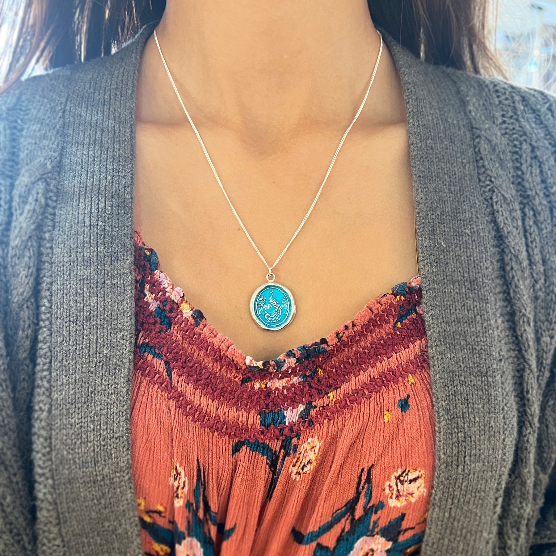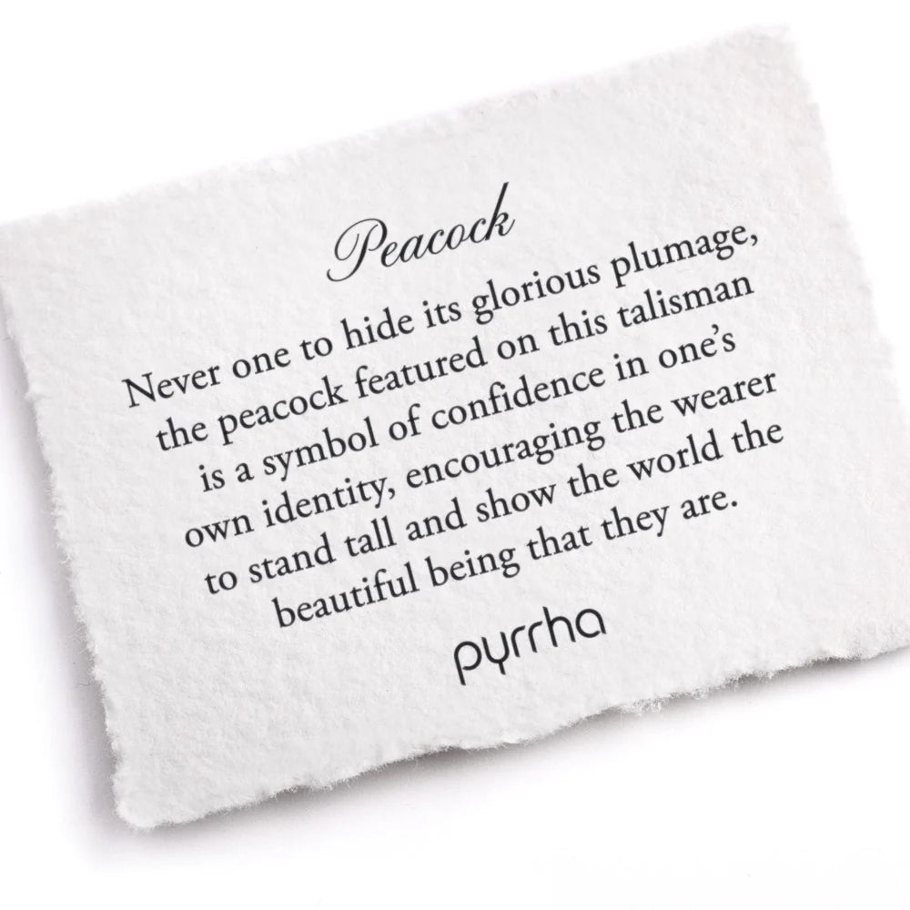 Instilling confidence, this talisman boasts a peacock with dancing silver feathers as a reminder to be secure and proud of one's own identity. Brightly colored in 'Capri Blue', this pendant necklace is vibrant and iridescent. Wear this piece alone, or stack with other Pyrrha pieces for an even more customizable, meaningful stack.
