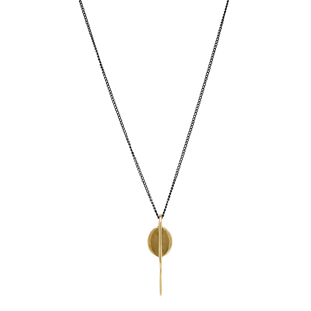 A sleek yet understated necklace, the high polished pendant is crafted in yellow gold, contrasting nicely with the oxidized sterling silver curb chain. A staple piece from Erin Cuff's collection, this necklace can be layered with more of her work or worn alone.