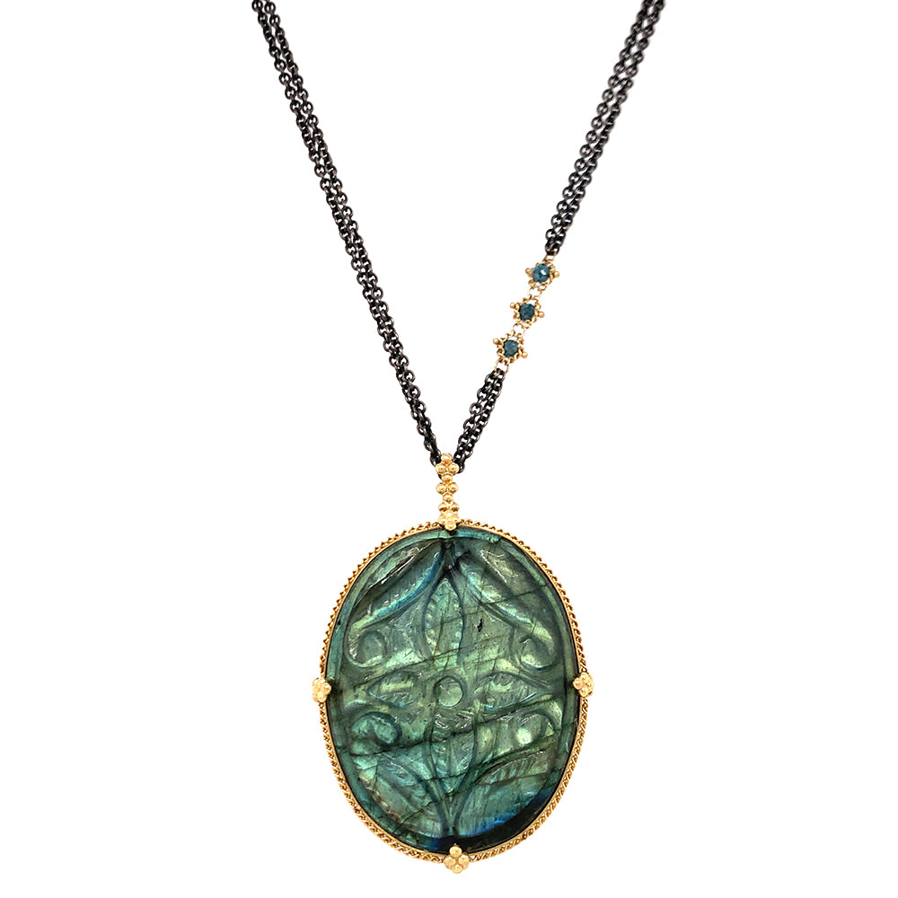 As the light reaches the surface, the water dances, twisting and flowing under the moonlight of the mystical lake. Amali's hand-carved stone with its metallic, iridescent glow has embodied this illusion of moving water on a static pendant. Paired with rich 18K yellow gold and sparkling blue diamond beads along the side, this necklace exudes elegance and prestige, not just in appearance, but in its weight and craftsmanship.