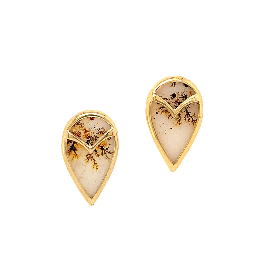 These one-of-a-kind earrings feature teardrop-shaped Montana agates, each adorned with intricate dendritic inclusions that resemble delicate natural landscapes. The bezel style setting includes a subtle "owl" motif, with a graceful chevron detail at the top of each stud, evoking the soft curves of an owl's face or feathers. The warm tones of the gold beautifully complement the earthy hues and translucent quality of the agate, making these studs a distinctive and elegant statement piece.