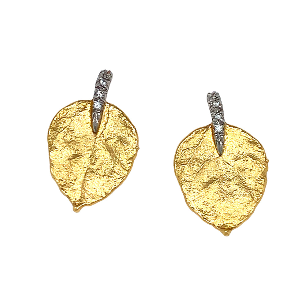 Classy and inspired by nature, these small yellow gold aspen leaf earrings are just perfect! With subtle texturing and lifelike veins, the "aliveness" of these pieces can only be crafted by innovative techniques. The yellow gold leaf is hanging from a platinum stem that is accented by diamonds. The contrasting metals contribute to an impression of understated elegance. A definite "must-have" to add to your jewelry collection!