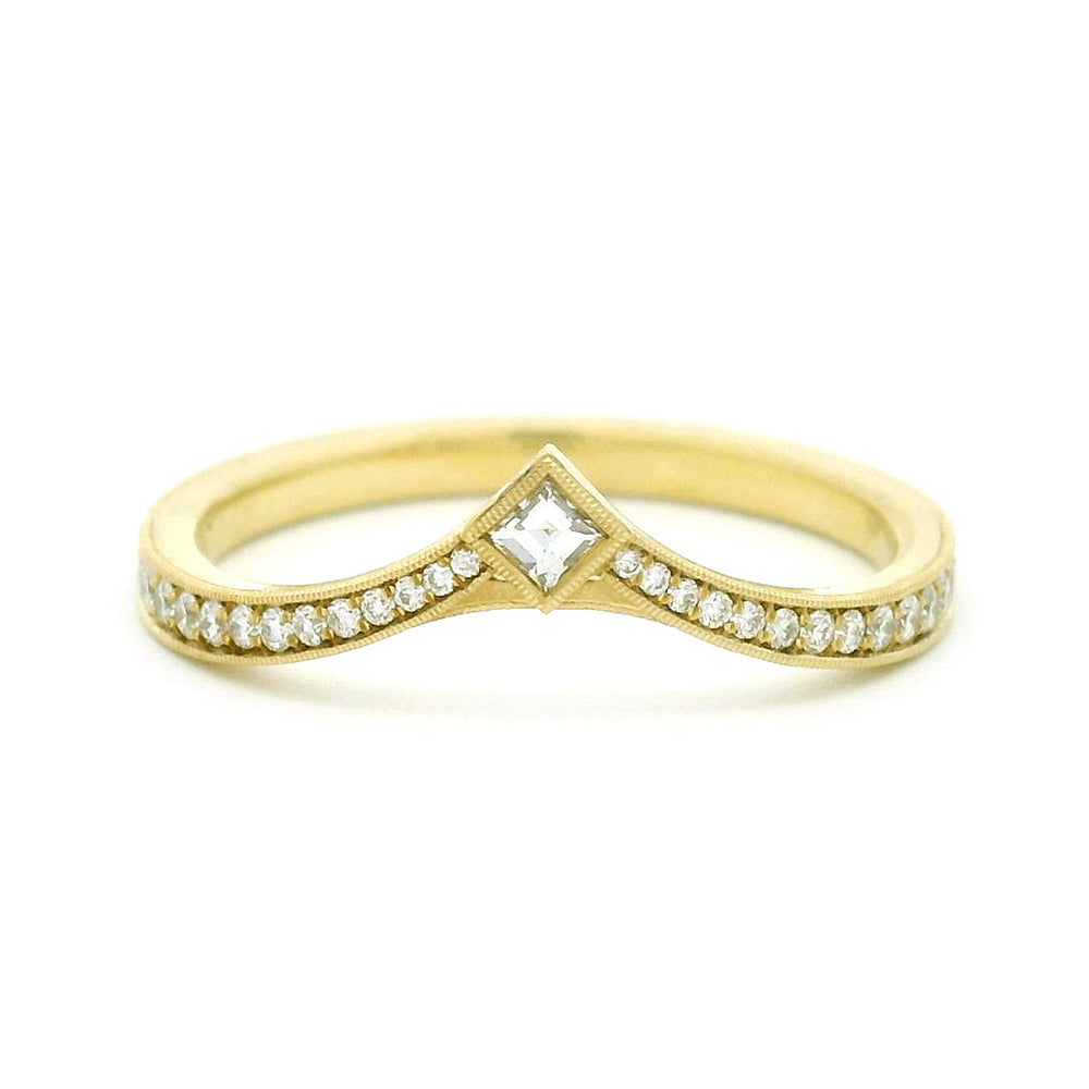 Elegant with a modern twist, this finely handcrafted "Twyla" band by Erika Winters is perfect as a non-traditional engagement ring or stackable wedding band. The bespoke ring features a bezel-set step-cut diamond and is adorned on either side with graduated diamonds and milgrain accents.