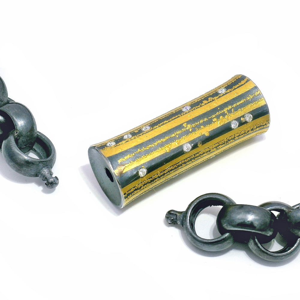 Sculptural and richly textured, this Vario pendant by Atelier Zöbel is crafted in sterling silver and accented with radiant 24K yellow gold. Its elongated, cylindrical layered form evokes natural mineral veins, while scattered diamonds add subtle points of light throughout. Designed for versatility, Lode can be paired with an optional blackened sterling silver Vario chain, allowing it to be seamlessly integrated into a layered or standalone look.