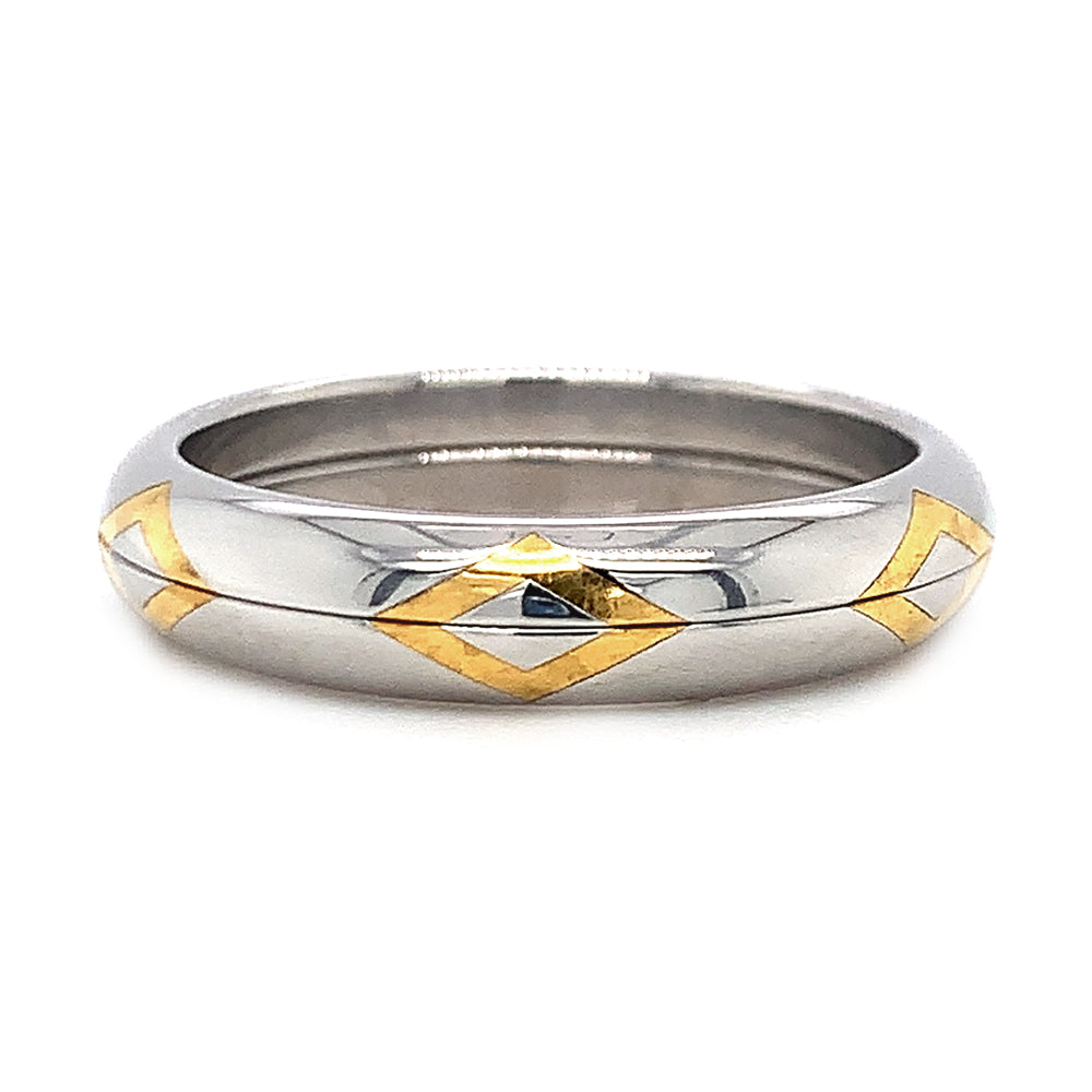 This band has a high polish finish and a golden inlay design. Mixing both silver and gold tones offers a timeless yet unique choice when picking the perfect piece of jewelry. The material it's made of is also very durable. Polarium is a revolutionary permanently magnetized platinum alloy developed by Steven Kretchmer for a line of jewelry that exhibits amazing behaviors, including levitation. It is 77.7% pure platinum, extremely hard, and resists scratching far better than any other precious metal jewelry alloy available anywhere.