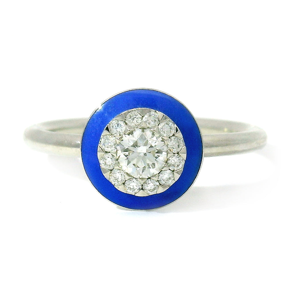 Celebrate your inner happiness with a charming touch of color! This platinum ring showcases a sparkling center diamond encircled by petite accent stones, perfectly complemented by a delicate periwinkle blue ceramic halo.