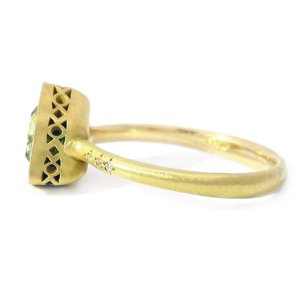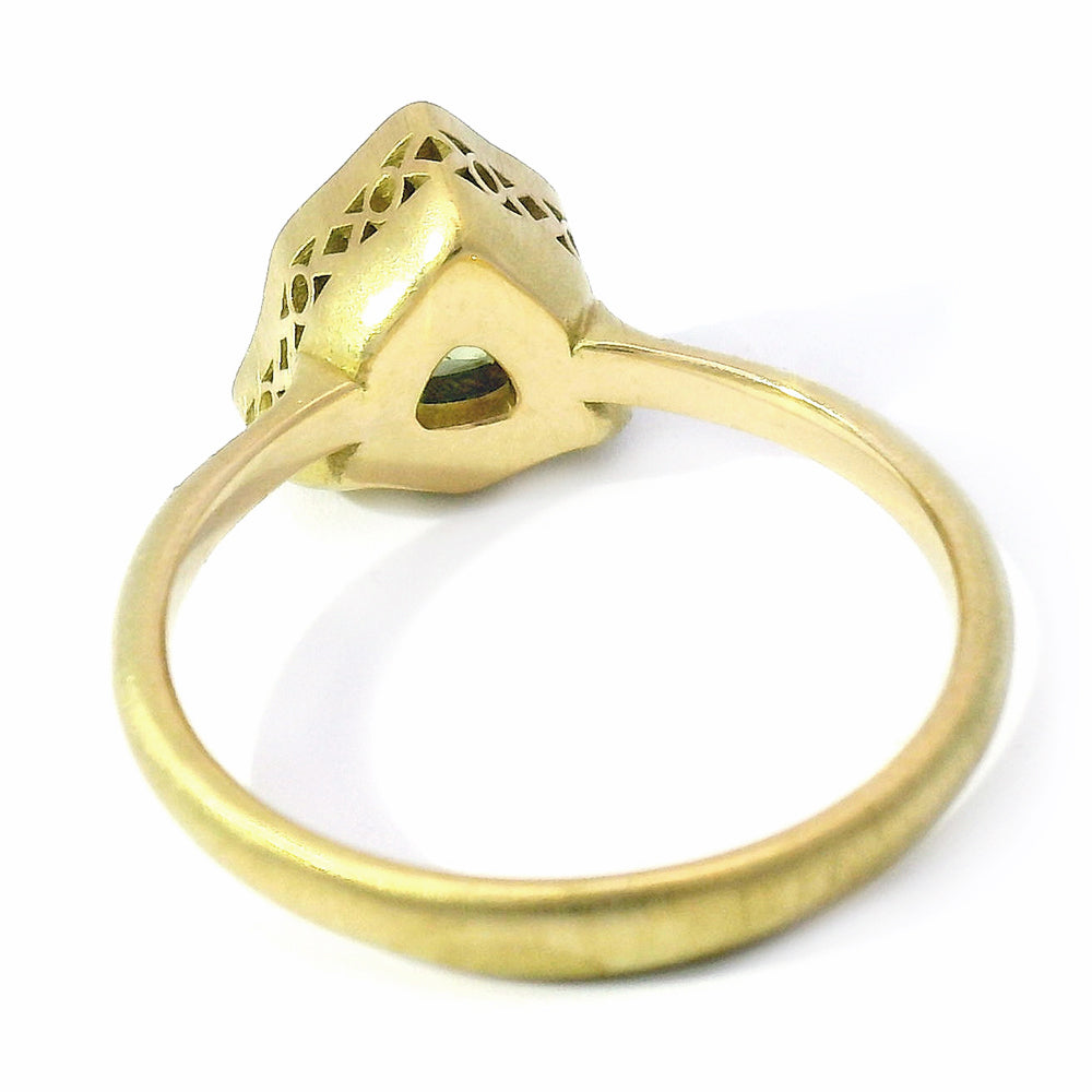 Peer into a tapestry of color & texture with this gorgeous one-of-a-kind ring by Adel Chefridi. A green trillion-shaped Montana sapphire calls to mind light flickering through a dense forest canopy on a magical afternoon. Adel Chefridi's signature delicate cutout details show off the stone's stunning radiance, and hand-engraved accents adorned with petite brilliant diamonds complete the design.