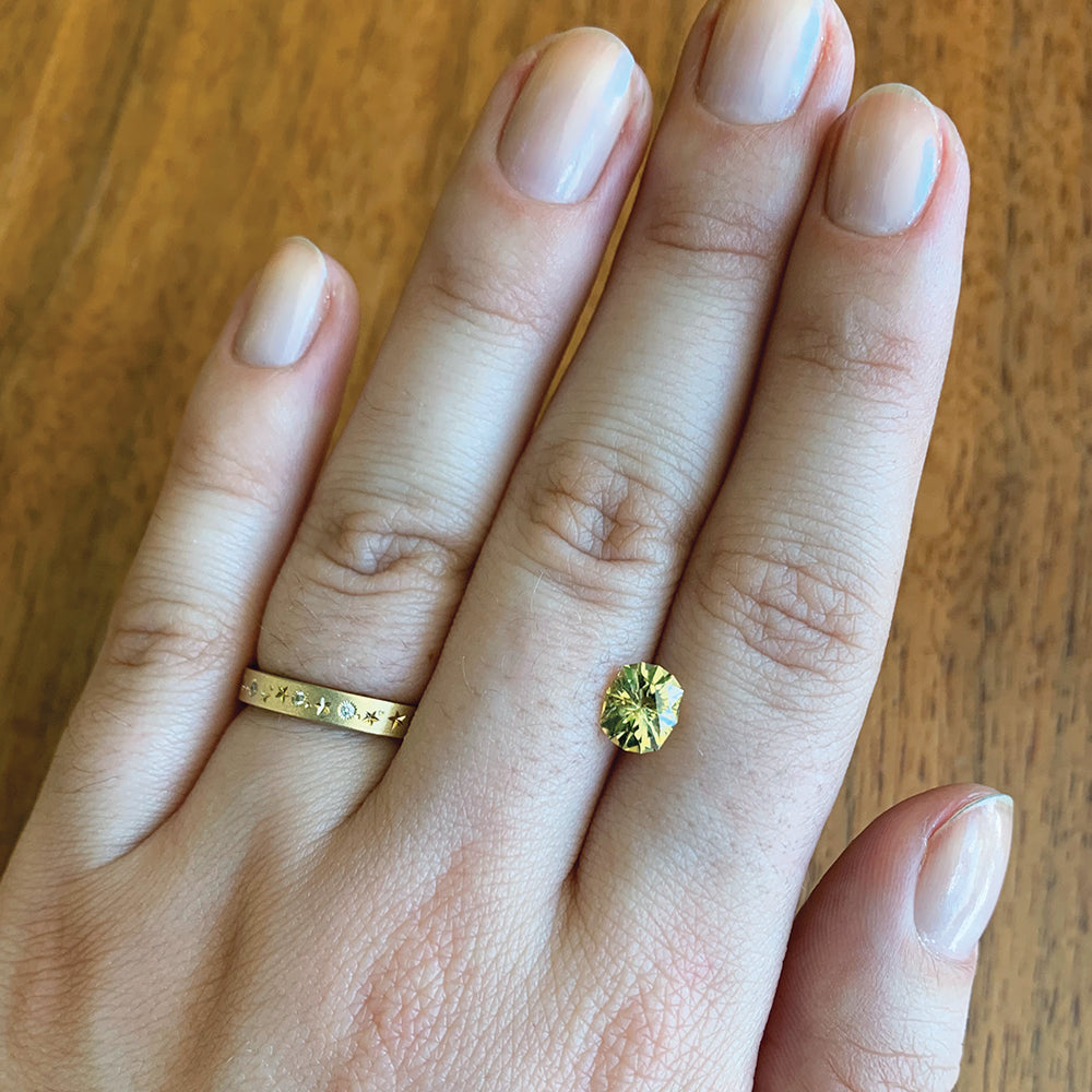 Shards of brilliant golden light form a kaleidoscope within this gorgeous fancy-cut Montana sapphire. With sunny tones of canary yellow glinting out from a subtly geometric silhouette, this stone is a one-of-a-kind treasure perfect for your next piece of custom jewelry!
